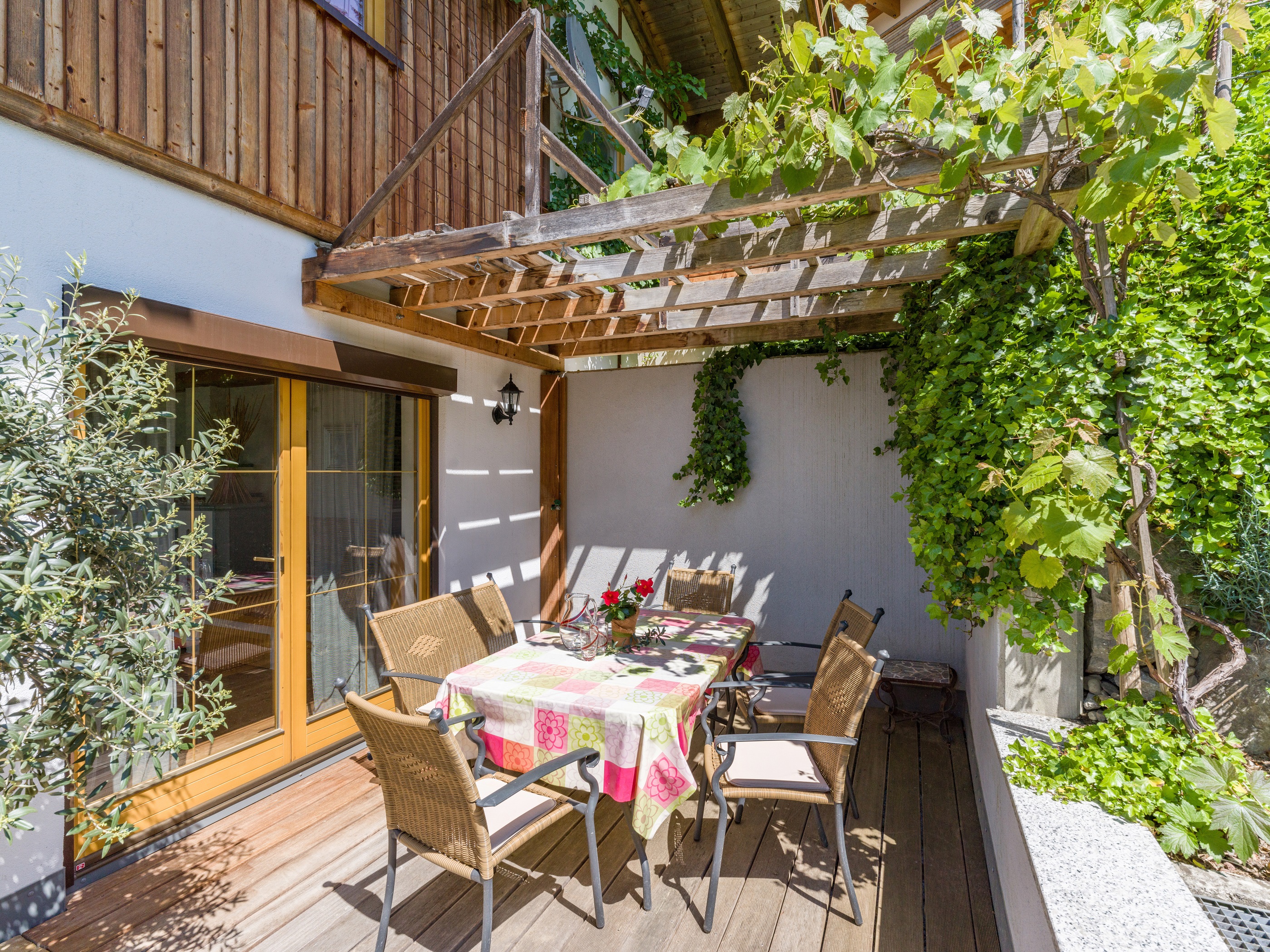 Die Wohnung besitzt einen eigenen Eingang und eine teils überdachte Terrasse direkt vor der Haustür.